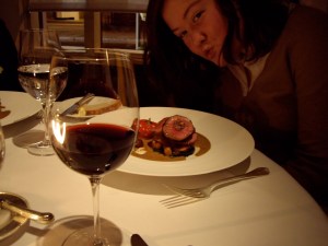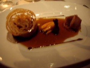 We started with champagne, single malt and fruit juices, and were brougth “canneloni” of smoked salmon and avocado, crispy potato slices with cream cheese and garlic in the middle. Those amuses were followed by pumpkin soup with truffle garlic butter on a cheese pastry spoon to be mixed into the soup. After more than a day of little to eat, both Scott and I thought this was the best thing we had ever tasted.