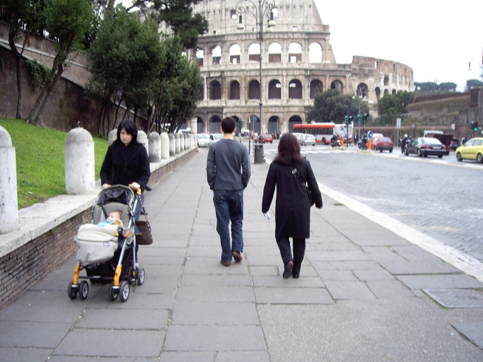 We head out from the hotel to walk to the Colosseum (or Colosseo in Italian). I had used the via Michelin website to get directions from the hotel to the entrance to the Palatine Hill where we are to meet our docent. The instructions are very detailed, which was good in my view because, although at times we are walking on what seems to be the same street, the name changes when we cross a road. The instructions say it should take 35 minutes to walk but it does not include our stopping to take photos along the way or when we unexpectedly come upon the Trevi Fountain (Fontana Trevi), more time for Robin to toss in a coin. It turns out that this is the only time we pass the Trevi when there are few people around.