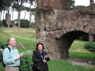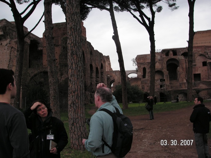 The Palatine Hill, according to legend, was where Romulus founded the city in 753 B.C. (on April 21, to be exact). We start at the remnants of the aqueduct of Claudius and Olivia gives us a basic overview of ancient Roman history from tribal settlements, the republic, to the emperors. Robin is quite keen on this since Scottish law has aspects of Roman civil law and he has learned some ancient Roman history. For Scott and me, this is mostly new or stuff we have long forgotten.