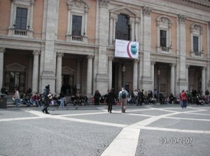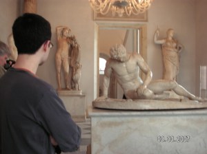 We decide to go to the Capitoline Museums for lunch. Michelangelo designed the Piazza Campidoglio, with its famous reproduction of Marcus Aurelius’ bronze equestrian statue. The original is in its own room created in time for the 2000 celebrations of the Catholic Church. Olivia gets us through the rather confusing process of ticket buying and checking extra bags and coats, which involves going in and out various doors while avoiding going out the doors that would require we re-purchase entry tickets. [Entry for the Capitoline Museums is €6.5]