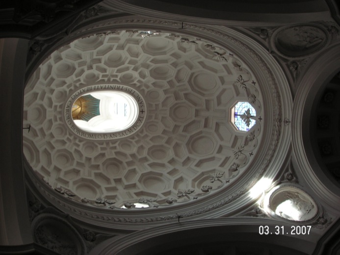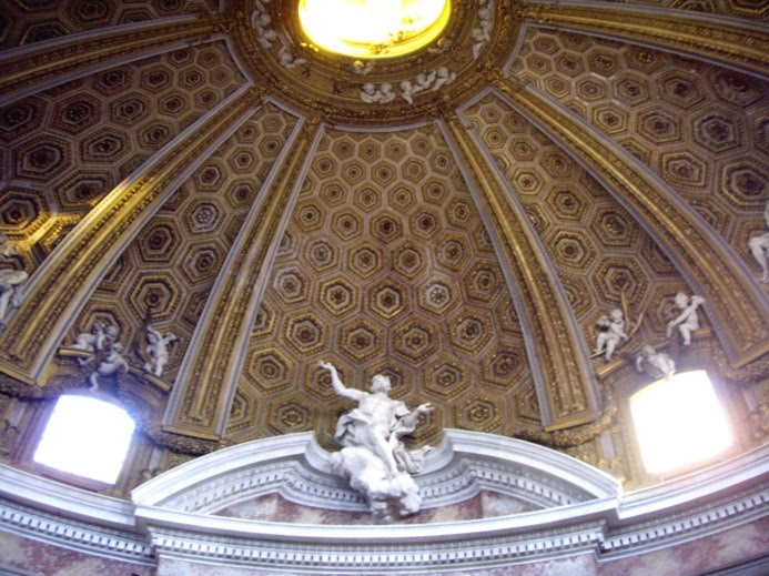 Only two short blocks away is San Carlo alle Quattro Fontane, [Via del Quirinale, 23, open Mon-Sat 10-1, 3-6 p.m.; Sun noon-1, 3-6p.m.], a church designed by Borromini, who was Bernini’s chief rival as an architect. The church also gets called San Carlino because it is so tiny. The design of the church and its dome plays with curved lines in remarkable way to create shadows forming a sense of animation and not mere decoration.