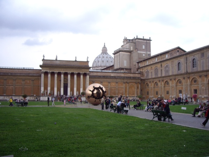 To get to to the ticket booths, we ascend a very long escalator. The ticket area is quite new, again, built for the 2000 celebrations. Robin, again, gets a discount as a student going to a university in an EU country. [Entry ticket is €13; €8 with student ID.] We begin our tour of the Vatican Museums in the courtyard where she explains the basic origin of the museums and discusses the Sistine Chapel because it will be hard to do so once we are there.