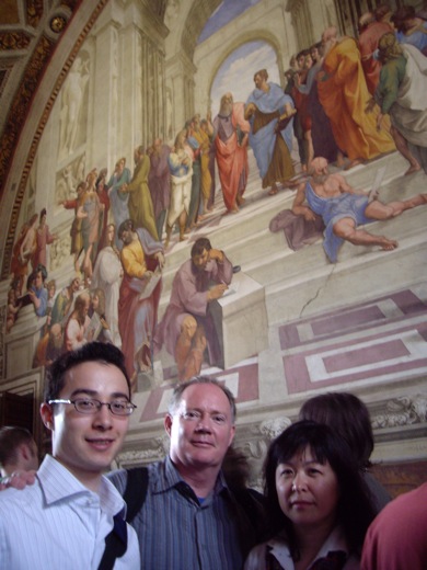 One has maps of Italy done in frescos, another tapestries including some designed by Raphael. The Raphael ones were woven in Belgium and have gold thread which sparkles as we look at them because someone has accidently pulled back the draperies over the window and allowed the sunlight in. In the Stanza della Segnatura, we get a photo of us in front of Raphael’s School of Athens because we have a poster of it in our diningroom.