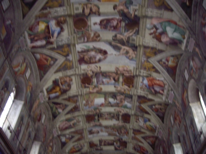 From the Raphael rooms, we go to the Sistine Chapel, where many people are ignoring the signs and announcement saying no flash. A guard somewhere keeps asking us to be quiet, but to no avail. The photos we take are very blurry because we don’t use our flashes. It is all so impressive and also oppressive because of the crowd. Some of the better photos were taken by Robin, who it seems used his flash.