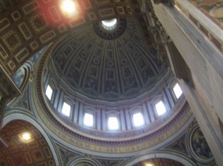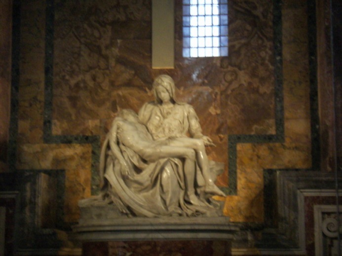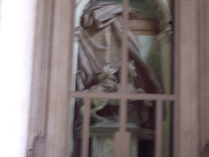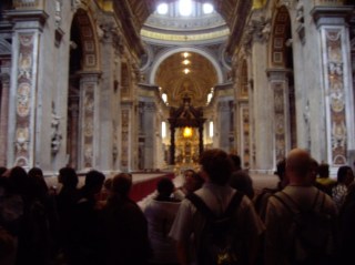 Seems silly that you can’t look at this great piece. The area is very wide and we’re not blocking the flow into St. Peter’s nor the long line to the dome or the crypts. In St. Peter’s, we visit the major works by Michelangelo, the dome, La Pietá, and Bernini’s Baldocchino (the canopy) and a statue for the tomb of Pope Alexander VII hanging over a doorway.
