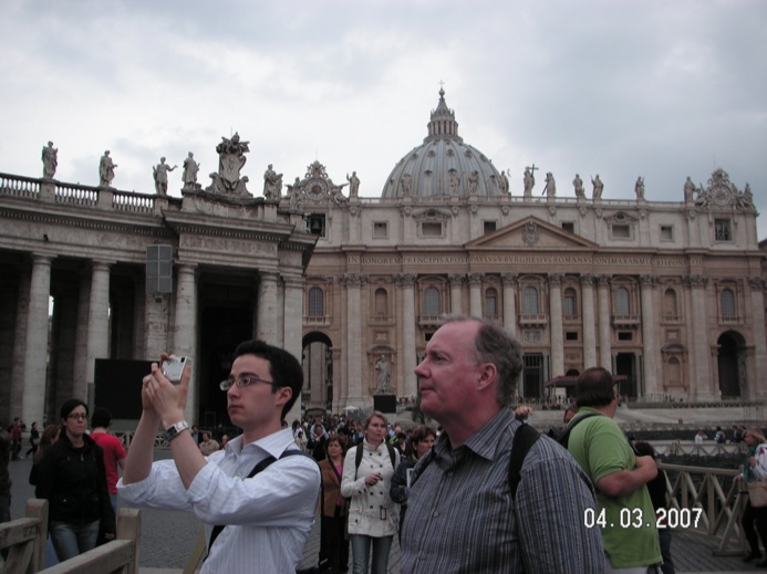We leave the Sistine Chapel to go to St. Peter’s Basilica, and look at Bernini’s Constantine statue which is at the end of a staircase just next to the entrance to St. Peter’s. Scott stops for a photo and gets told not to stop.