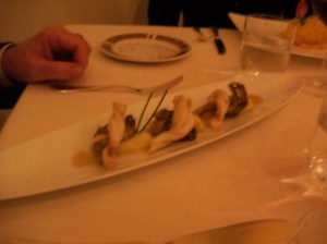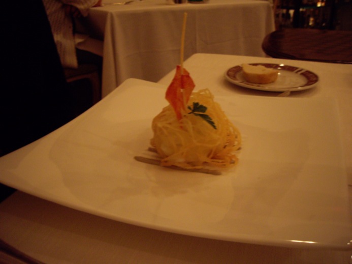 We are brought an amuse of a mozzarella stuffed mussel. It is amazing. We have sole and crispy artichoke with a curry spice in the sauce, rigatoni with quail meatballs, roast pigeon with fried noodles and tangerines; duck carpaccio with rucola and pineapple foam, baccala with artichokes; buffalo mozerrella wrapped in strings of potato and deep fried accompanied with anchovy and a sweet and sour red pepper sorbet; lamb four ways – a chop, stuffed outside of a chop, tripe and sweetbreads.