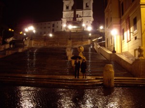 We walk back in light rain to see the Spanish Steps with no one on them — the only time — then back to the hotel. Allie calls us after I had texted her to tell her the phone card is finito and my cell still won’t work. More snow in Calgary. Birthday boy and my son decide more cards are in order and more wine. Crazy. This time it’s poker, which I don’t know how to play. We stay up until almost 2 a.m., a smart move since we’re planning to catch the 8:50 am train to Venezia.