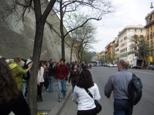 From there we go to meet our docent, Rebecca Moholt, outside Trattoria da Paolo at #104 Viale Vaticano, which is located across the street from the entrance to the Vatican museums. We see the line to the museums from a long way away. It is probably a kilometer long. We can’t find Rebecca right away because she is in line for the tickets to the Vatican museums. Somehow, she sees us and crosses the street to collect us. She goes back to her place in line and an old British guy gets angry at us saying he’s been in line for an hour and a half and we should go to the back of the line. Rebecca says she told him she was leaving her place in line to get us and that she’s been waiting just as long as he has. He is furious and points to us says that we haven’t been waiting for an hour and a half. Rebecca moves us as far away from him as she can but does not give up her place. We try to be quiet and small, and are into the museum ticket area in very short order.