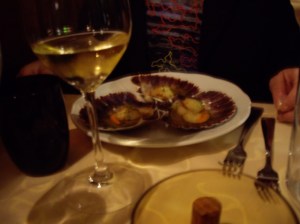 I have scallops which are seared and served with a drizzle of olive oil and something slightly acidic, balsamic vinegar, perhaps. They are so delicious. We have these with a Soave Classico.