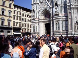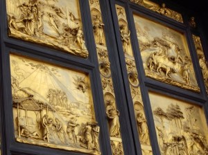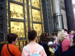 We leave from there to go to see the Firenze cathedral, baptistery and bell tower. The piazza is very crowded and the traffic whizzes around it at disconcerting speeds. The first stop is to look at Ghiberti’s baptistery doors.