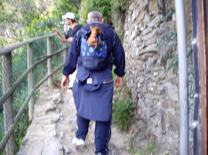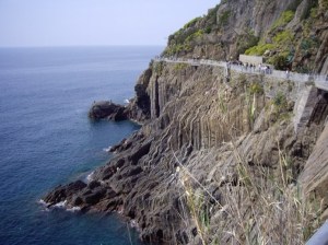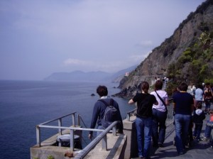 We leave the station knowing which track the train we need to catch is departing from (there aren’t very many tracks) and when a train arrives, we hop on. We should have listened to the track announcements and should have been suspicious because the train departs earlier than scheduled. On the train, the conductor tells us we have the wrong tickets. His English isn’t that good but he says this train is an InterCities. We get charged an additional €13.30 and the conductor and Scott go through a ridiculous debate in trying to get the correct change. The woman in the same compartment gets an additional charge as well and she’s incensed and calls on her cellphone to complain to a number of people. We have to get off at LaSpezia and buy tickets for €1.10 each to Riomaggiore. We get on that train and have to stand because it is packed. We later realize that we are now on the train we were supposed to have caught in Viareggio. We have spent €15.50 for our failure to pay attention to the track announcements.