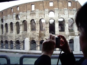 We get a cab and are driven by a crazy driver, who cuts off others and speeds like a demon. A woman driver pulls up beside us and gives our driver a hand gesture in that universal language. He was pretty crazy, but also kindly rolled down the taxi window when we are stopped at the light by the Colosseo and lets me take a better video. Unfortunately, the video is too big to upload here.