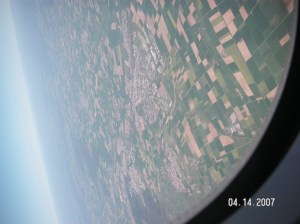 Frankfurt airport is crazy busy. Scott keeps looking at planes passing near ours as we get close to Frankfurt. We get off the plane on the tarmac and onto a bus for a ride to Terminal 1 where we catch our flight to Calgary. We can see a plane driving straight for the bus when we cross one runway. Scott takes a photo of what looked like it could have been a near collision.
