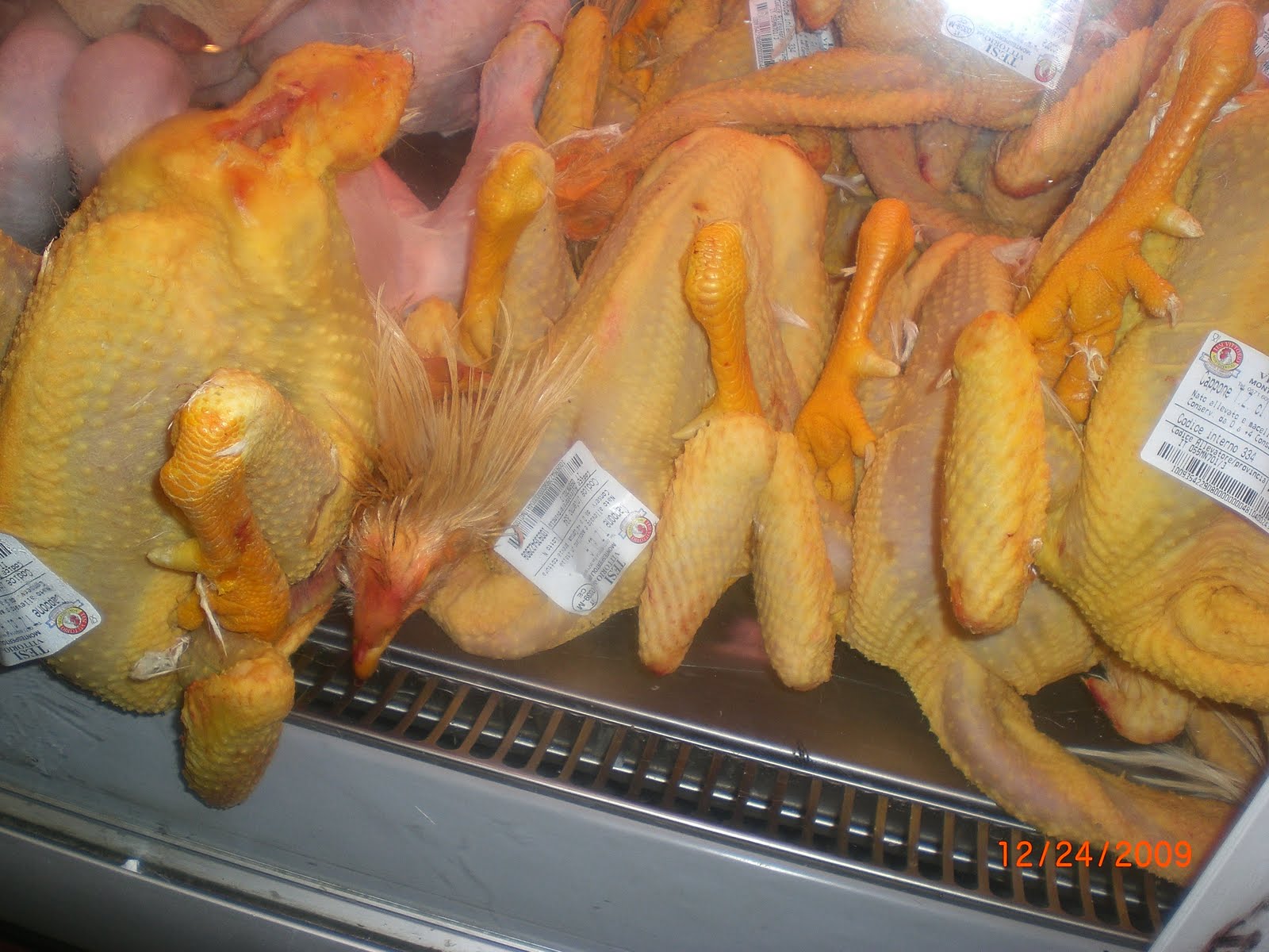 We all managed to cook Christmas dinner at the flat. Instead of turkey we roasted a chicken with thyme snipped from the plants you can see on the walls of the terrace. Below is chicken in the Mercato Centrale, where we bought our dinner makings. The chickens, many with head and feet attached, are enormous and easily substituted for a small turkey.