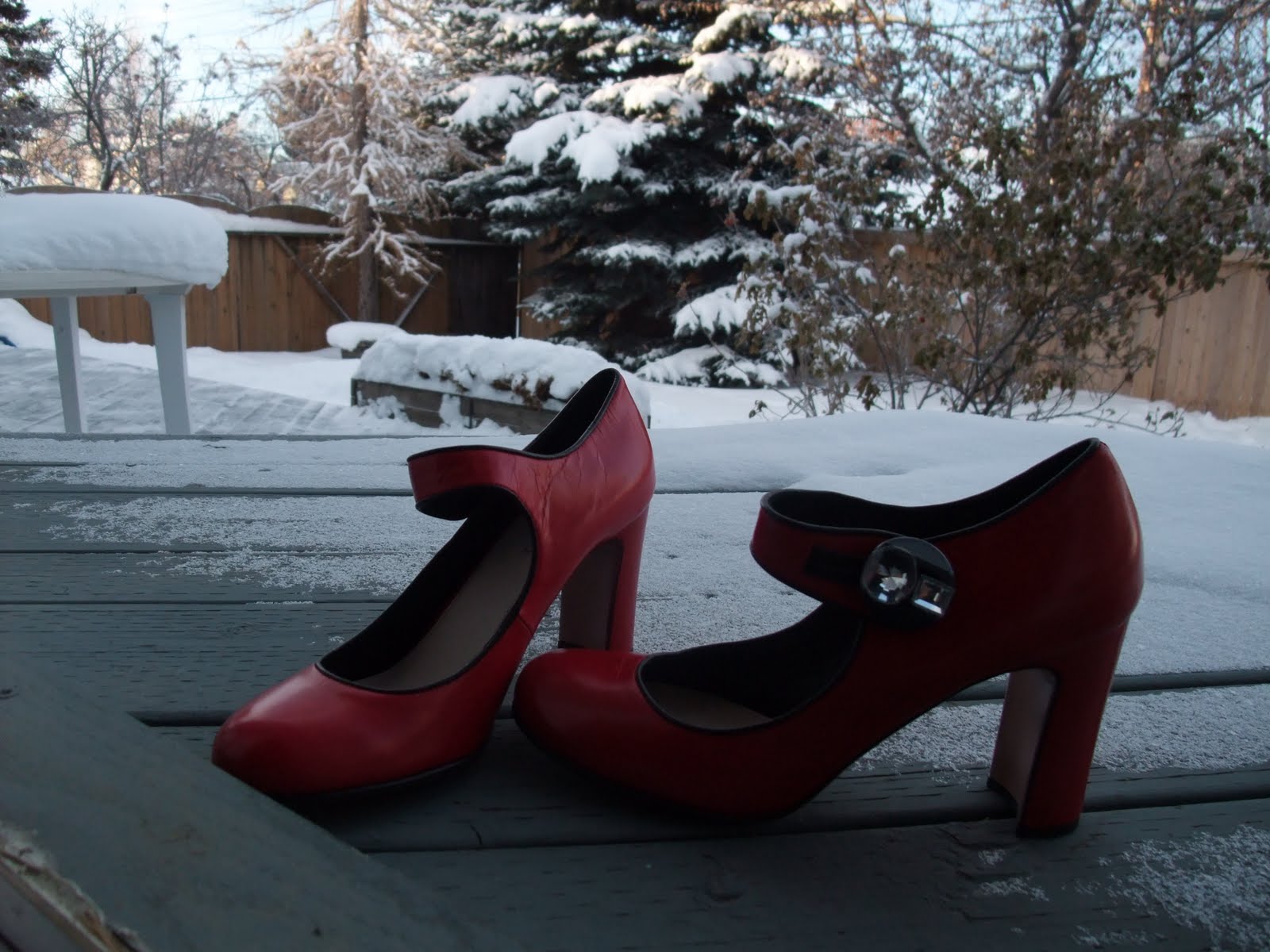 The background is our snow filled backyard. Look at the height of the snow on the table! How can I wear my new shoes in this weather? This morning the temperature was -26!!! I’m not going out of the house until it gets much closer to the promised high of -9. Instead, I’m spending this day off planning a return trip to Italy. There’s a news item that the Tiber river is threatening to flood Rome because of the torrential rains, but I’d take rain over the ridiculous temperature right now.