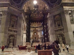 No longer do you get to go down a staircase which puts you next to Bernini’s statue of Constantine on a horse. So we said goodbye to Laura at the corner of the Vatican wall and trekked a fair distance around the walls to go into St Peter’s. It also gave Allie enough time to eat a panino or pizza type sandwich. We made the mistake of going to view the obelisk and fountain first not realizing that there is now a security system requiring you to pass metal scanners and an xray of baggage along one side of Bernini’s colonnade around St Peter’s piazza. That required recrossing the square before we could finally enter.