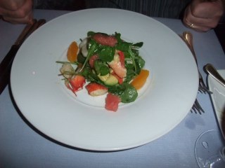 My starter of a mini pizza and Scott’s avocado and crab salad: