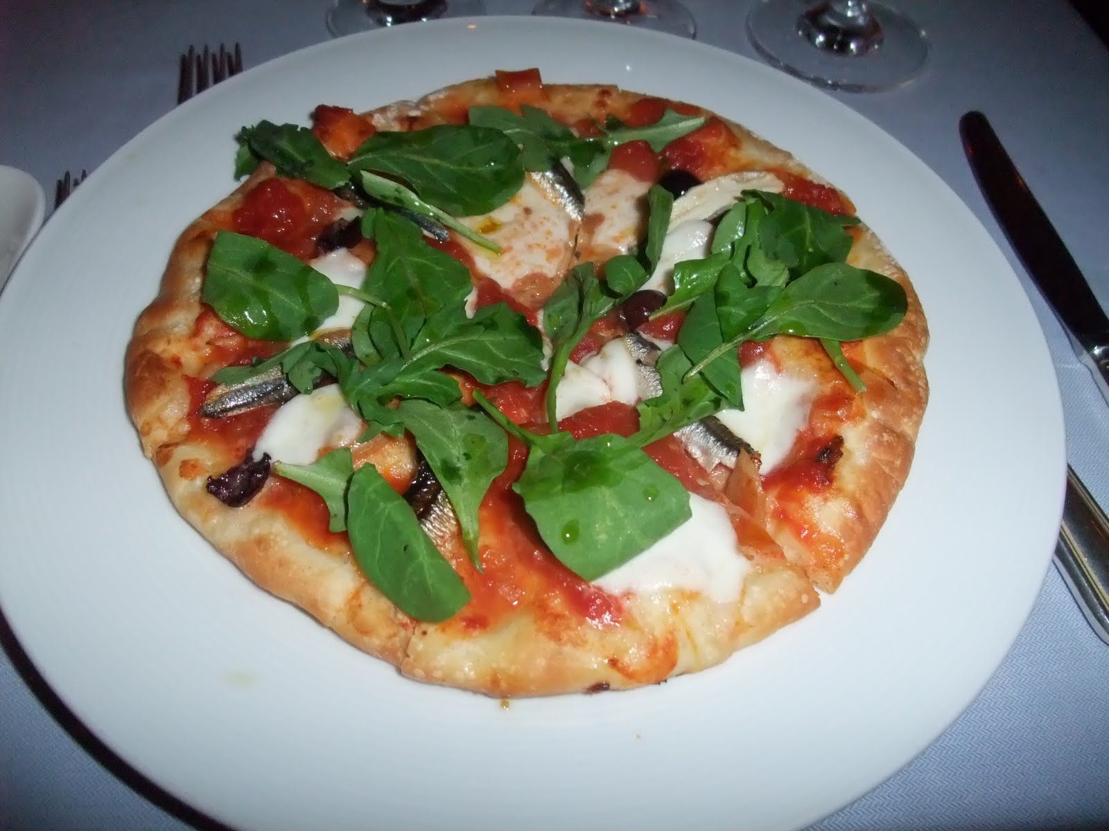 My starter of a mini pizza and Scott’s avocado and crab salad: