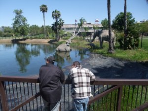 After lunch, we went to the Page Museum for the Le Brea tar pits which shows the history of the discovery of the fossils in the tar pits and displays the wooly mammoth, sabretooth tigers and other creatures whose many bones have been excavated. On the grounds, you can also see the pits where there is still excavation of the fossils. The pits and tar lake smell strongly of tar.