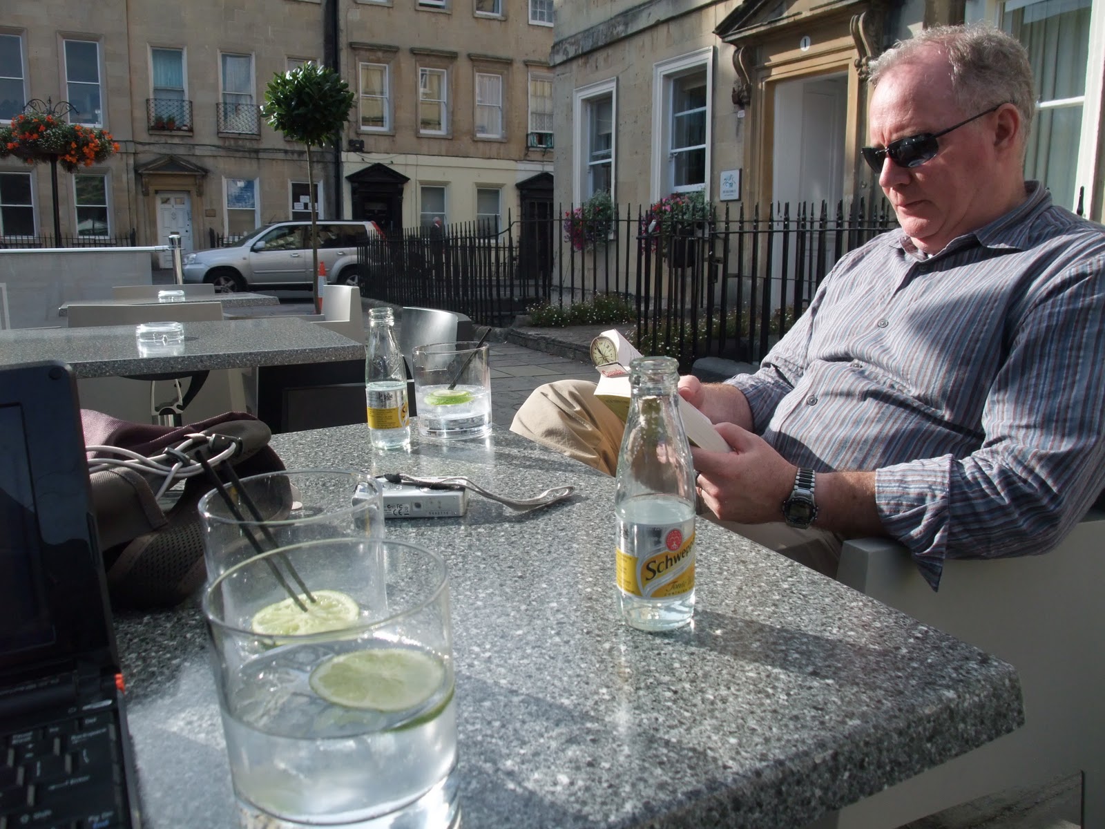 Had a sandwich and a half pint of cider for me, full pint for Scott at the pub on the upper level of the station. Kept checking the departure list looking for our platform. We couldn’t see Bath until we checked the departure board on the main floor which showed that the Bristol train stopped at Bath.