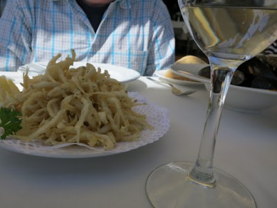 We stopped for lunch. We ordered seafood paella which was preceded by fried baby eels (we think), mussels and a salad. The paella was not as good as what we had in Madrid, but we found it very filling.
