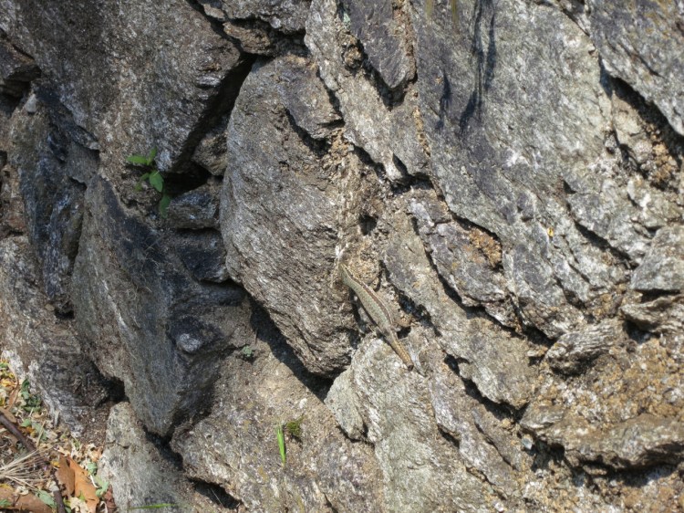 Lizards. In Milan and the three villages we’ve stayed at, we’ve seen little lizards with bodies about an inch or two with almost equally long tails. Most have been greenish grey or brown and black stripes. There’s one in this photo. Look from the centre at about 5 o’clock. I haven’t managed to phtograph them because they scramble away so fast.