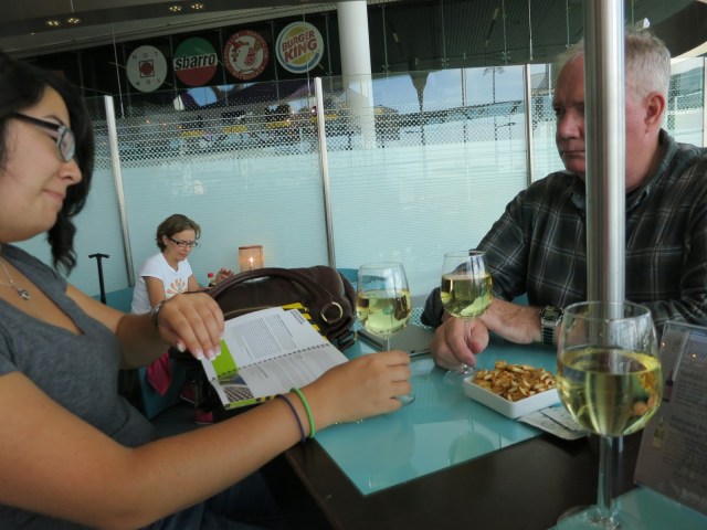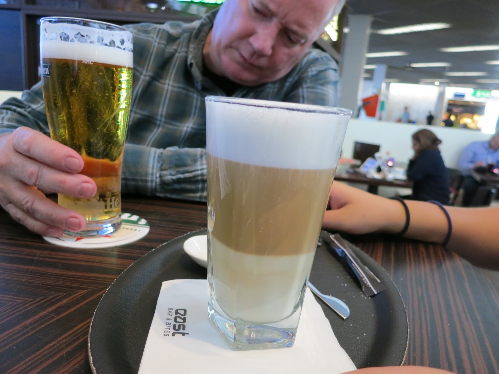 Landed in Amsterdam at 7:38 am, 11:38 pm Calgary time. We had almost 3.5 hours at the airport. Our food and drink was a bit confused–midnight snack or breakfast; beer or cafe latte.
