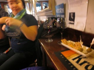 April 28 food tour: glasses of wine with pork tasting and fromaggi tasting, glass of house white with lunch