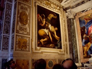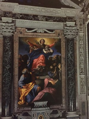 These two paintings occupy the sides of the chapel. Over the altar, in the most important position, hangs Annibale Carracci’s Assumption of the Virgin. Carracci sought to fulfill the Counter-Reformation aims by reverting to Renaissance style. For me, Carracci failed to create propaganda. The contrast between Carracci and Caravaggio elicits the response, “Pretty, but boring”.