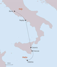 The tour leaves from London to Rome, the location of most of Caravaggio’s major works, and then follows Caravaggio’s travels over the last four years of his life: Naples, Sicily and Malta.