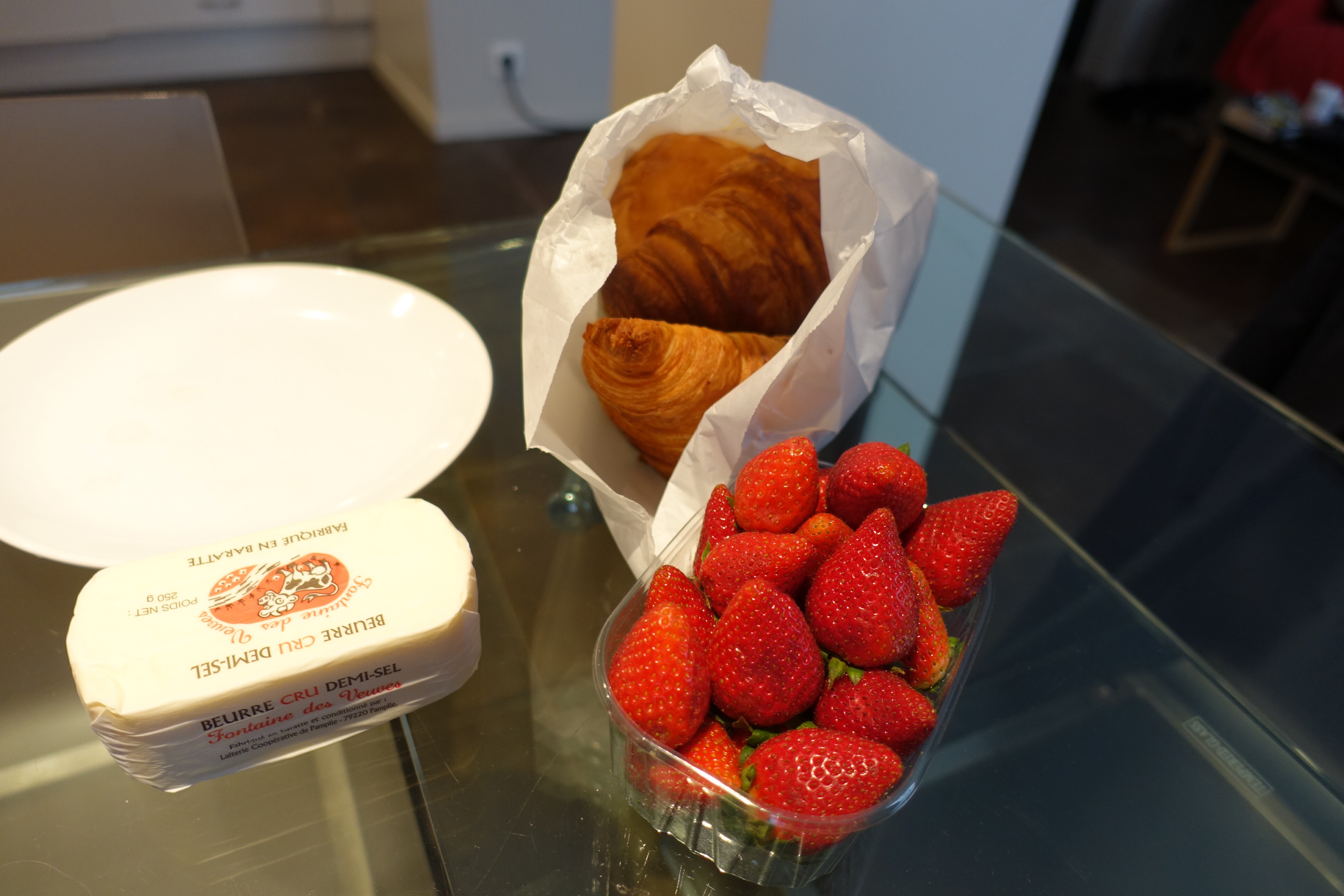 Bought strawberries at a nearby market because they smelled so good. Tasted pretty good, too. And the croissants were manifique! As was the bon beurre. Saving the pains au chocolat for tomorrow.