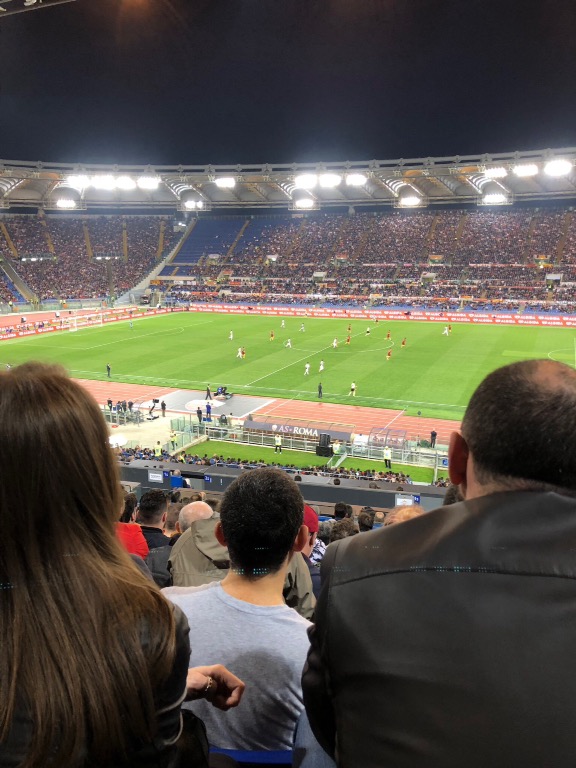 We went to a match between AS Roma and Juventus in Stadio Olimpico. The crowd was the noisiest we have ever experienced–even in the supposedly neutral section. Not sure that Italians are neutral about anything much. There are empty seats on either side of the north end where Juventus fans are seated. Roma supporters are on the south end with all the large banners. They set off flares, red smoke bombs and never stopped singing. The game ended in a scoreless draw.