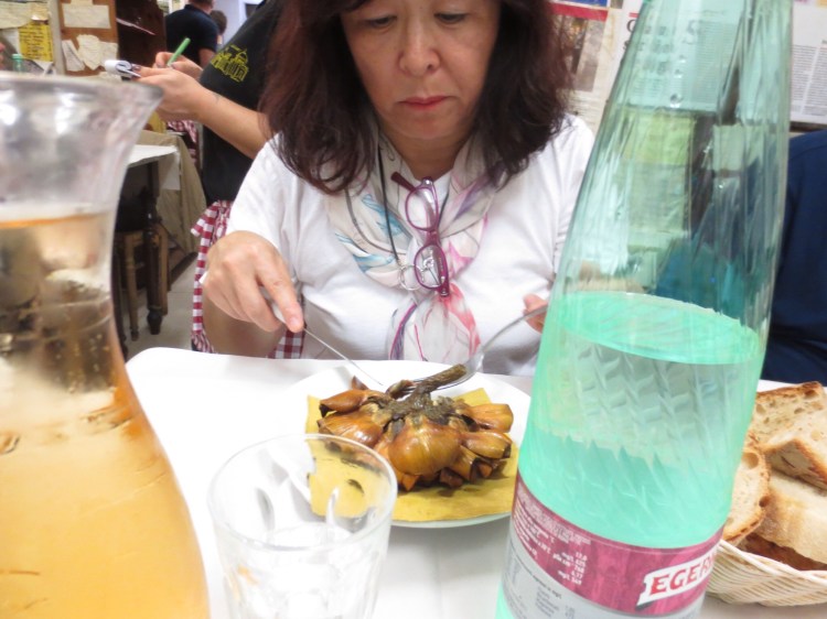 We were jammed in so tightly, I could not get my camera out of my bag. But Scott caught me looking at my favourite carciofo alla guidea, fried artichoke.