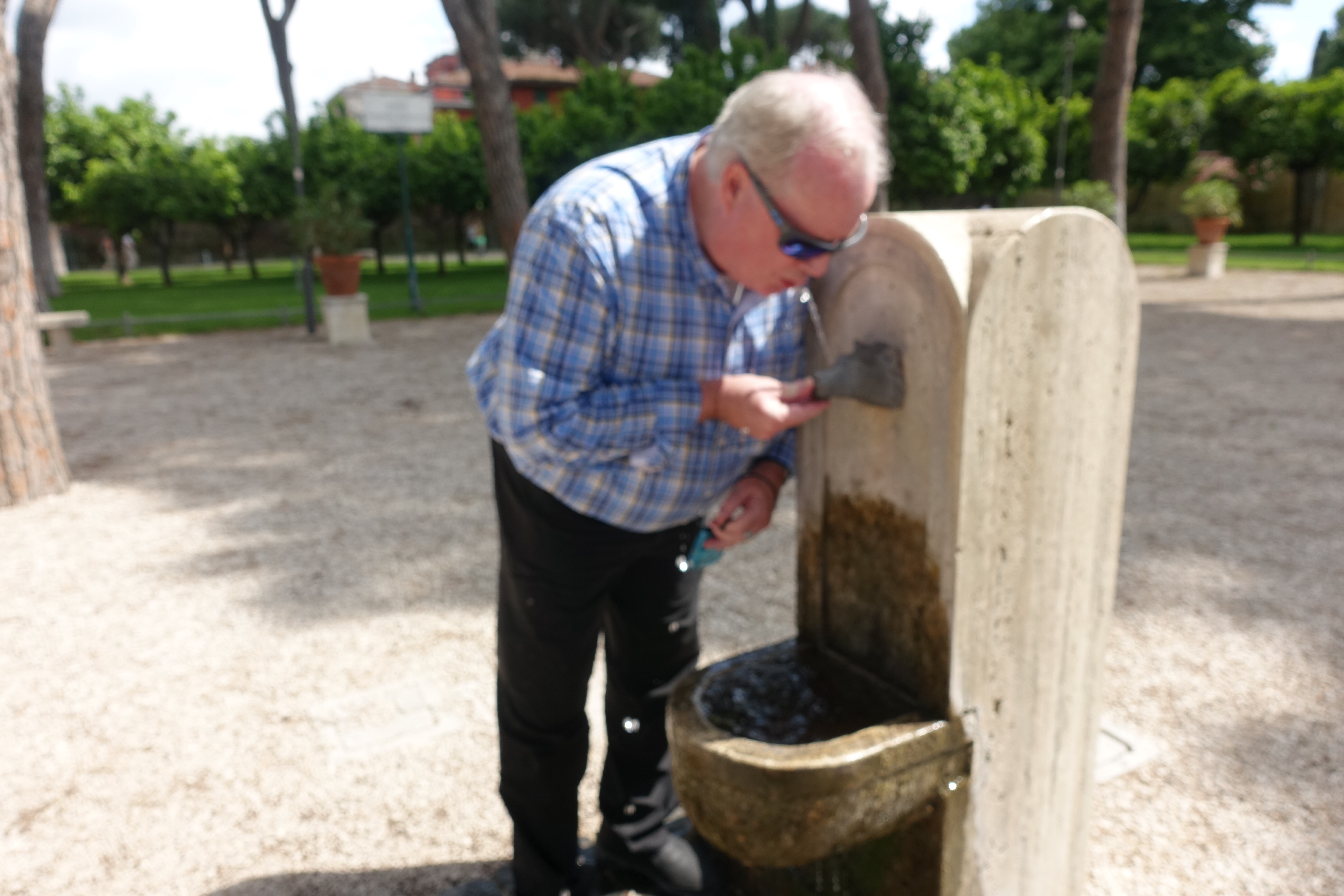 Scott demonstrating how to use a public fountain. If you plug the down spout, a stream shoots out the top.