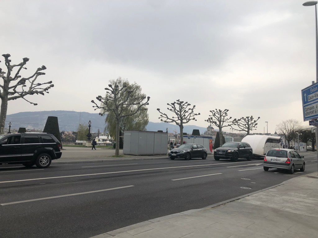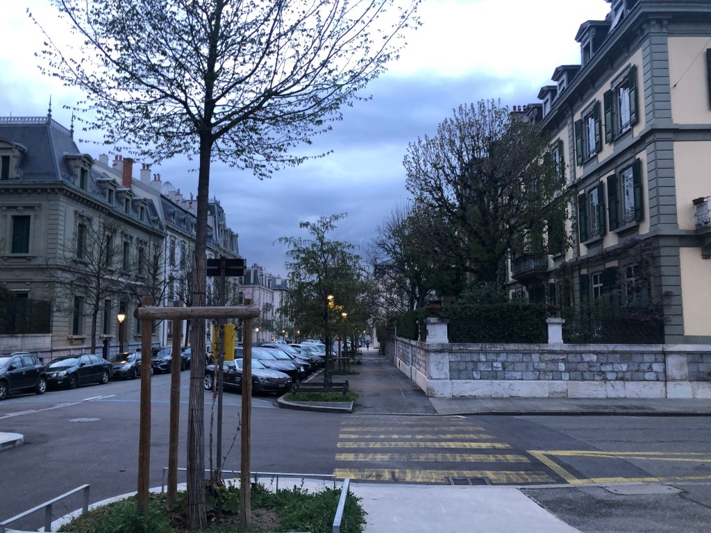 The historic centre of Geneva is on a hill. Looking from across the lake, under the branches of the second-from-the-right plane tree, you can see the top of Saint Pierre Cathedral, which is the highest point of the historic centre.