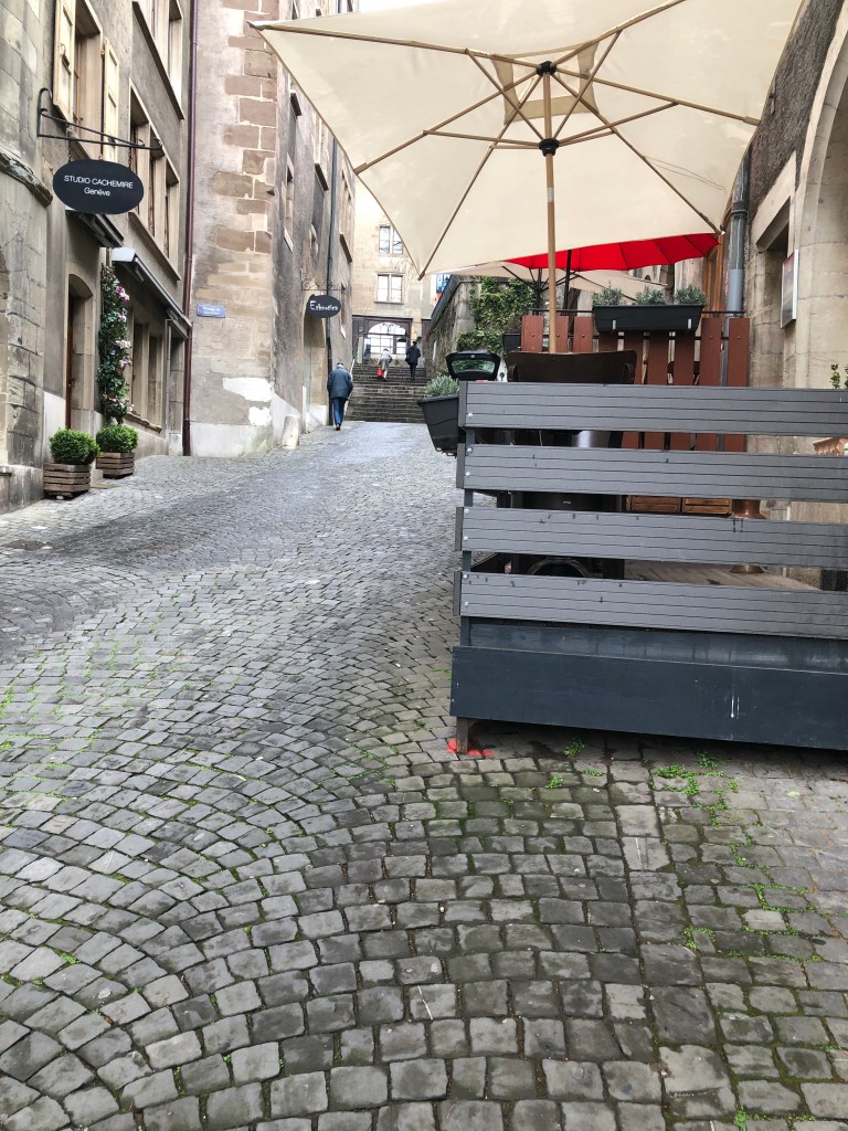 To avoid aggravating Scott’s knees, we have had to figure out how to avoid going up and down the hills of the old centre. Scott wanted to get to the jewellery shop on one of the steepest of stairs and streets we have seen. So, we took the bus to get to the bottom of those steps. We still had to climb a couple of less steep steps to get to Sous les Pavés, a custom jeweller. It’s has the burgundy coloured sign on the left of the photo below.