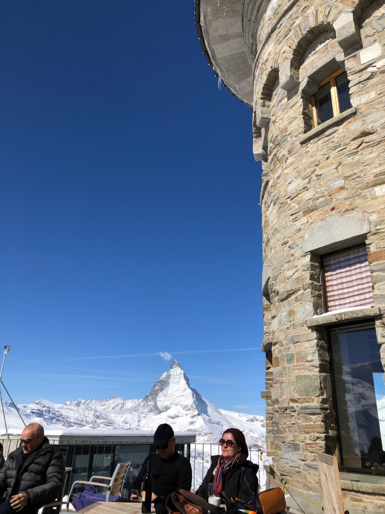 The Gornergrat is 3,135 metres high; shorter than the Matterhorn at 4,478. We noticed the altitude. Running up one flight of stairs left me short of breath.