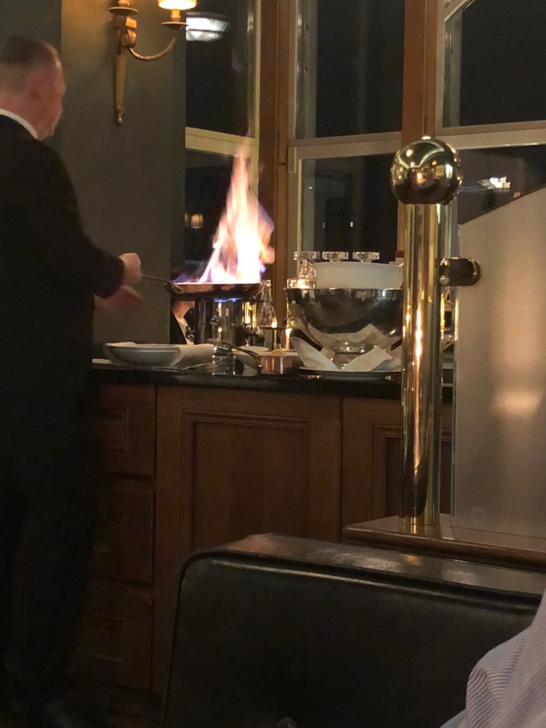 I could not finish the thin but plate=size veal cutlet. Nevertheless we ordered dessert because they had Crepes Suzette, which Scott made once about 35 years or more ago.