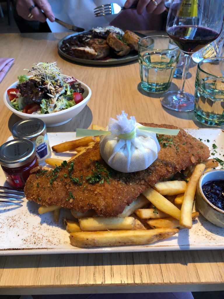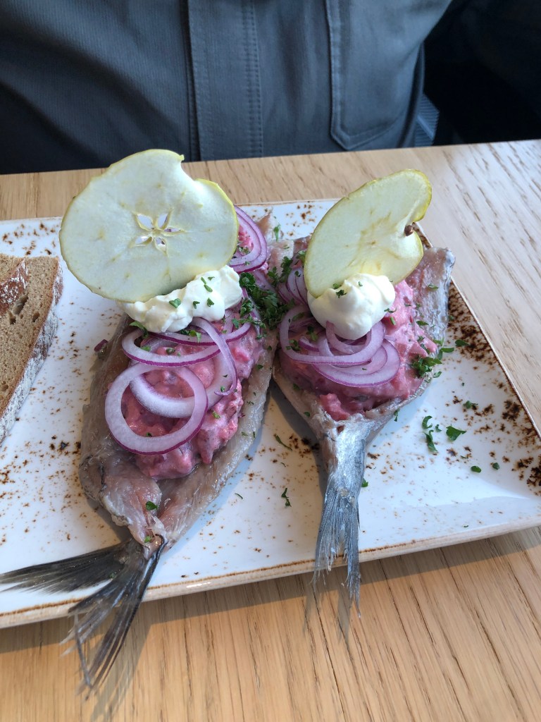For dinner, Scott decided to start with pickled herring and then to try saurbraten, a German beef pot roast with red cabbage. His came with fried dumplings. I continued my veal obsession.