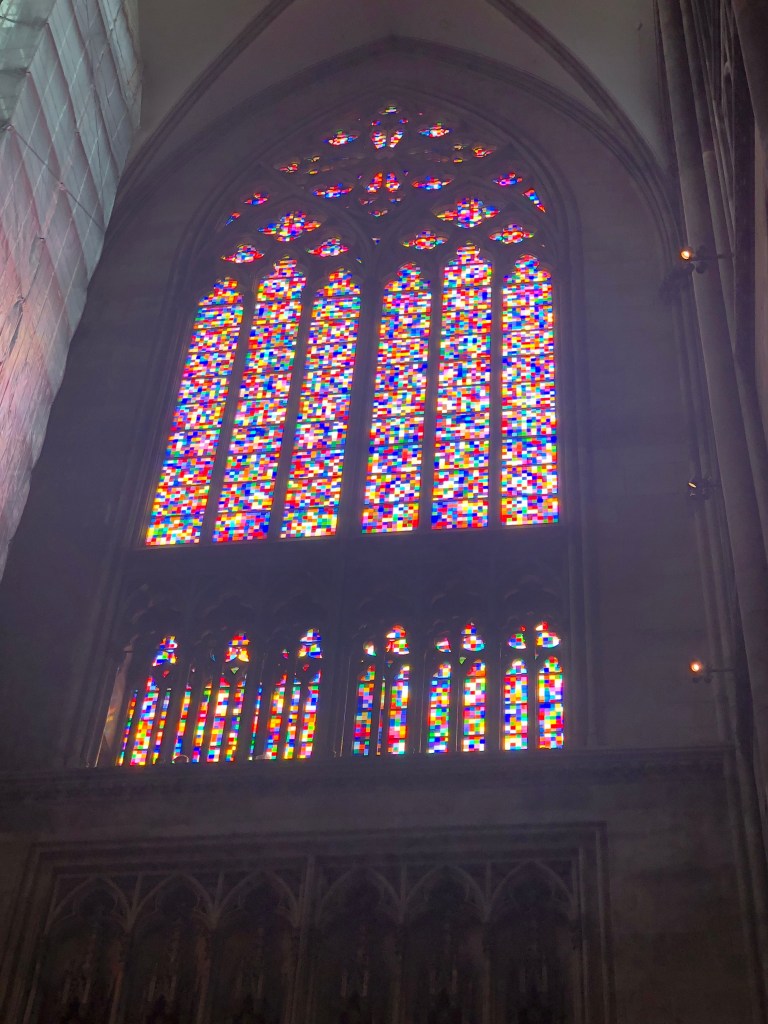 The stained glass windows were destroyed in WWII. One of the replacements is by Gerhard Richter. Some people do not like that it is abstract and not representational.