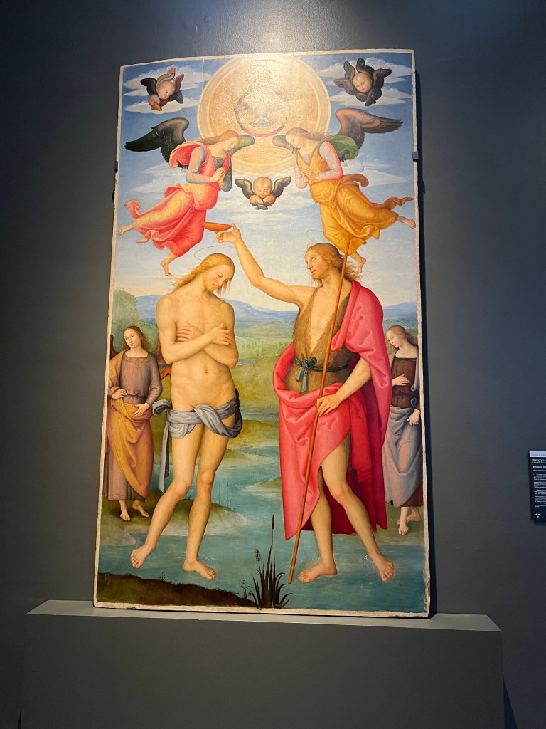 The gallery was featuring loans of works by Perugino (ca. 1446-1523) who was born Pietro Vannucci in Citta della Pieve in what is now Umbria, close to the city of Perugia, thus his nickname. He was one of the early Italian oil painters, and according to Vasari, he was apprenticed to the workshop of Andrea del Verrocchio alongside Leonardo da Vinci, Domenico Ghirlandaio, Filippino Lippi, and others. Piero della Francesca is thought to have taught him perspective form.