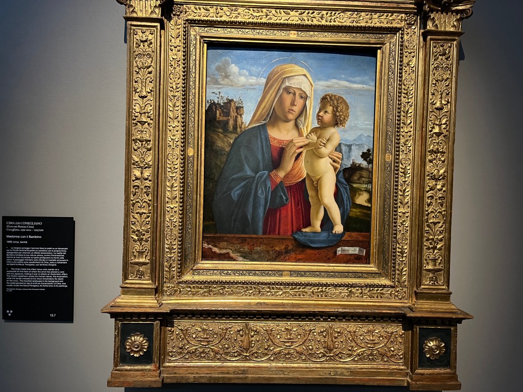 They have a lot of Renaissance artists from the northeastern area of Italy, many with names not well known. One who should be better known is Giovanni Battista Cima, called Cima da Conegliano or Cima (c. 1459 – c. 1517), who was a Renaissance painter, mostly working in Venice and considered part of the Venetian school, though he was also influenced by Antonello da Messina in the emphasis he gives to landscape backgrounds and the tranquil atmosphere of his works. Bologna has a small but typical work.