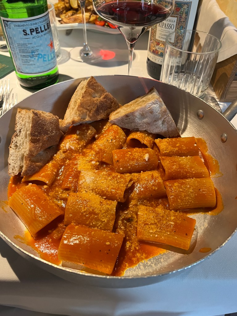 My Amatriciana is a Roman specialty. Scott found it too al dente but I thought it was properly cooked but too much quantity especially because it included chunks of bread for scarpetta which is the term used for mopping up the sauce with pieces of bread shaped like a little shoe. It used to be considered bad manners to scarpetta in a restaurant but for this dish it was obligatory.