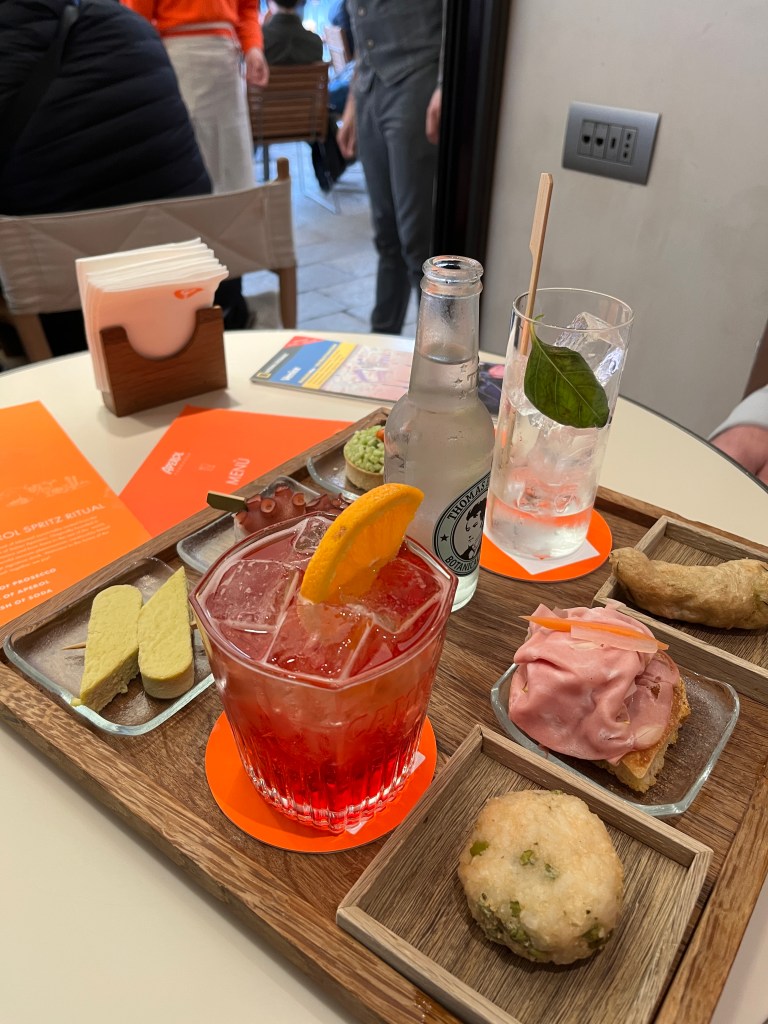 For dinner, we went to another restaurant in Campo Santo Stefano, Terrazza Aperol. They are very big on Aperol Spritz as the name suggests and serve small plates of food and cicchetti, Venice’s small bites.