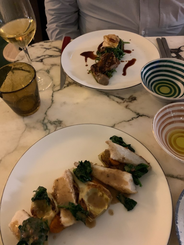 Scott had chicken with spinach and fava beans; mine was monkfish with artichokes spinach and tomato confit