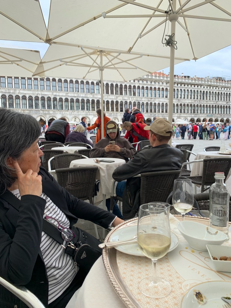 The historic cafe occupies a famous position on Piazza San Marco and charges you for the fact that an orchestra plays cheesy Italian-ish tunes. We paid more for an indifferent lunch than any of the delicious dinners we have enjoyed this trip. The desserts, which were too much and super-expensive, were good.