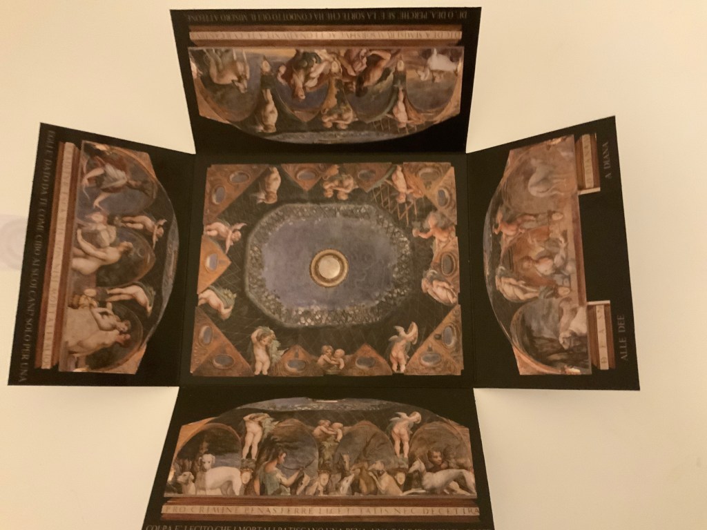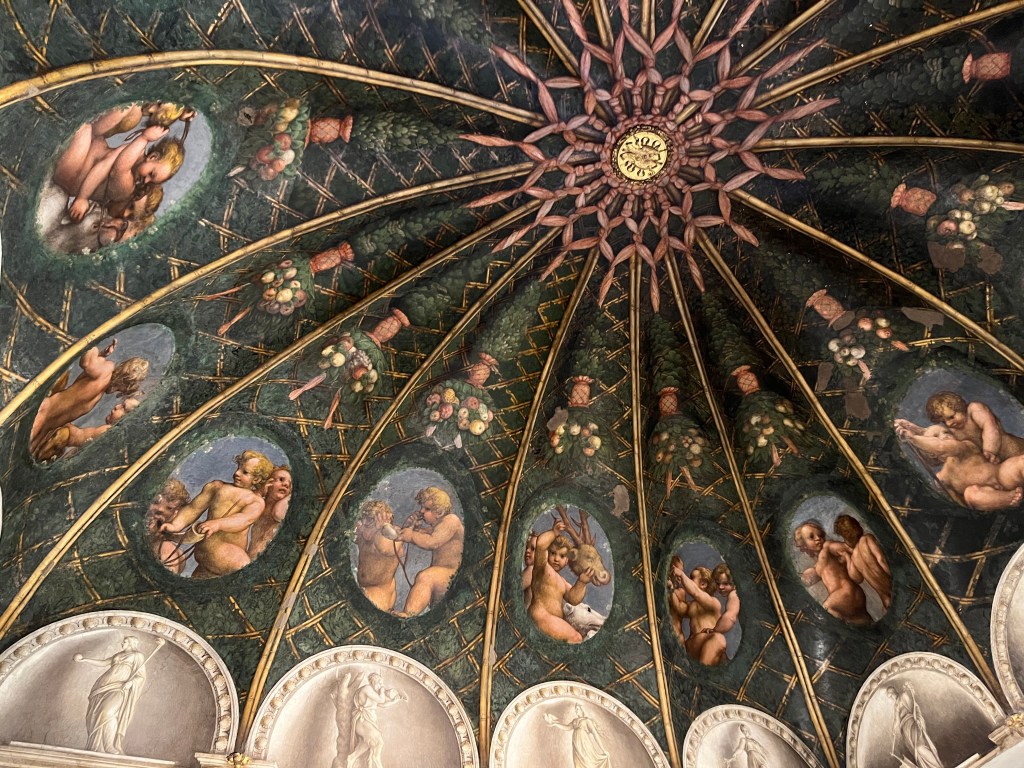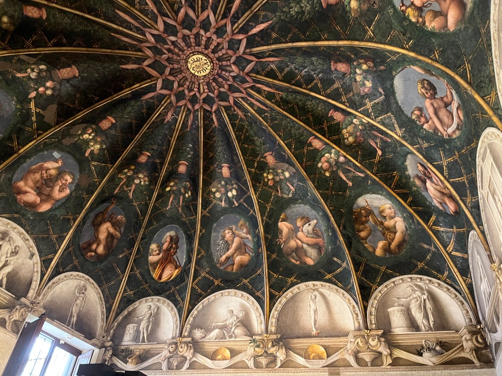 Parmigianino was 10 years younger than Correggio and clearly saw the Camera in San Paolo as he repeats the illusionist pergola. Again, the purpose of the room and interpretation of the images are unknown.