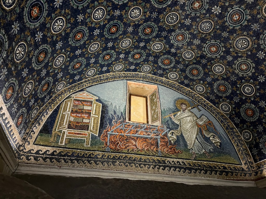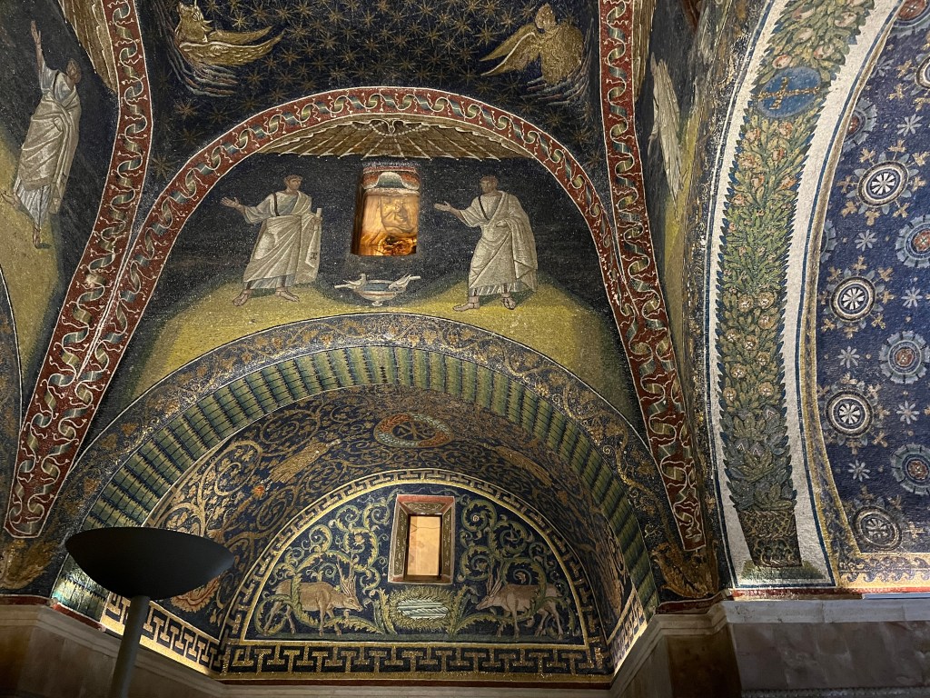 The so-called Mausoleum of Galla Placidia from around 450. It is a small central planned building but no one knows what the building was used for but very unlikely a mausoleum as Galla Placidia died in Rome and is believed to be buried there. The mosaics are amazingly well preserved.