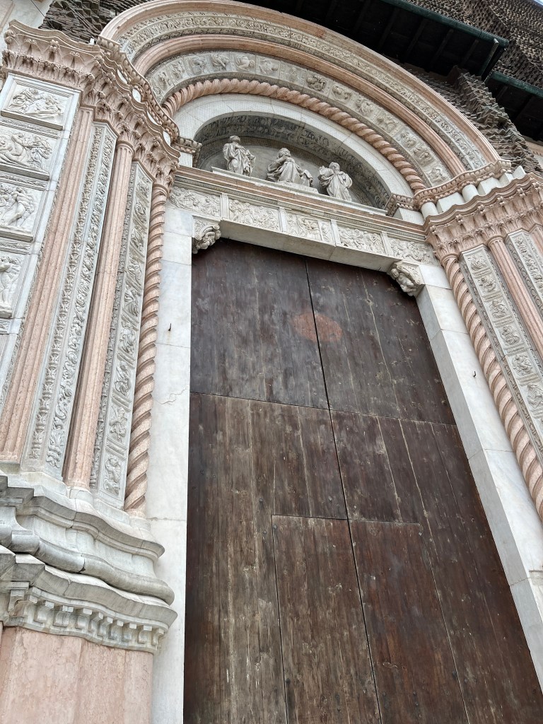 Jacopo della Quercia (ca. 1374 – 20 October 1438), also known as Jacopo di Pietro d’Agnolo di Guarnieri, was an Early Renaissance sculptor who inspired Michelangelo. The work of della Quercia shows a shift from the International Gothic style to classical aesthetic principles that value symmetry, simplicity and harmony with special attention to perspective and proportion. Della Quercia sculptures over the main door.